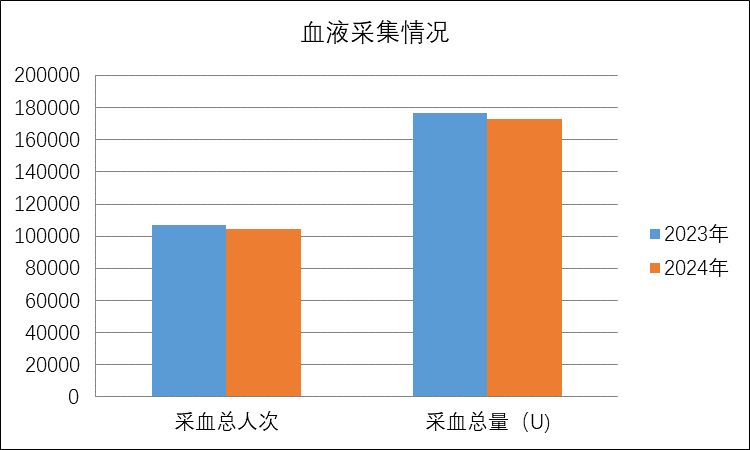 自2024年1月至12月,全年献血共计104640人次,献血量34.62吨,同比分别下降2.36%和2.17%;供应各类血液产品366224.75单位,同比下降了6.87%。